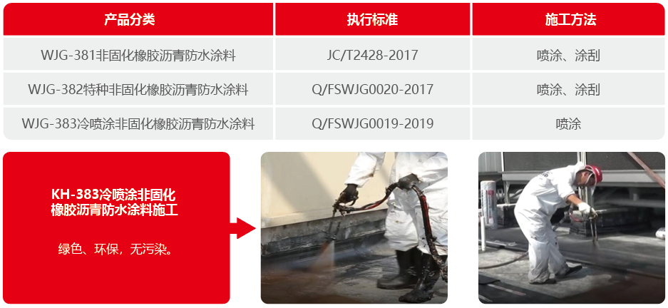 ◆ KH-383:施工準備→基層清理→細部節(jié)點施工→大面噴涂→后續(xù)卷材鋪貼→自檢驗收。
